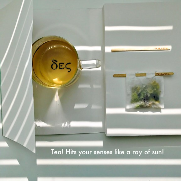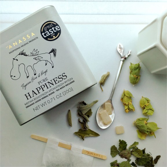 Right now I’m crazy about ANASSA tea. To be honest it was their beautiful packaging that first drew me to their fragrant and tasteful blends. Starting with the outside, I liked see modern, sleek and minimal light grey metal boxes with illustrations of Gods; my favourite blend, Happiness, is represented by Pegasus, the divine winged horse, and contains a lovely and uplifting mix of savoury Mountain Tea (shown to have as many antioxidants as green tea), fine Mint, intense Sage and Lemon balm. Then upon opening the box, you’ll get an elevating whiff of aromatic herbs, and inside see something completely unique – a packet of biodegradable tea bags and a bunch of thin wooden sticks you can thread through them to rest on the top of your cup. And talking of cups they have even designed a glass mug with the word “δες” inside, meaning “see”, which reflects beautifully on the sides as you drink.
