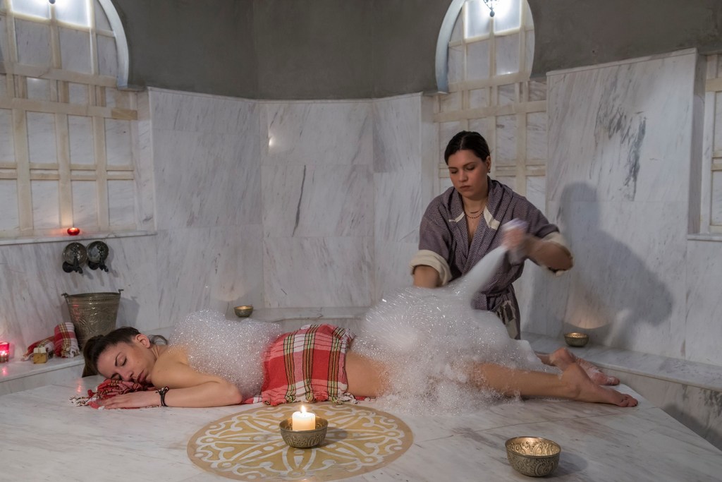 The next part was the best, as the therapist repeatedly dipped a silk pillowcase into a bucket filled with olive oil-rich soap, which she waved around creating giant clouds of foam that she layered over me. It’s probably the closest anyone can get to feeling like they’re inside a cloud. She then proceeded to use the oily foam to offer me a full body massage that left me blissfully relaxed. After that, she washed my hair with a rich almond oil soap and slathered my face in a chocolate mud mask, which she left to infuse for 15 minutes.
